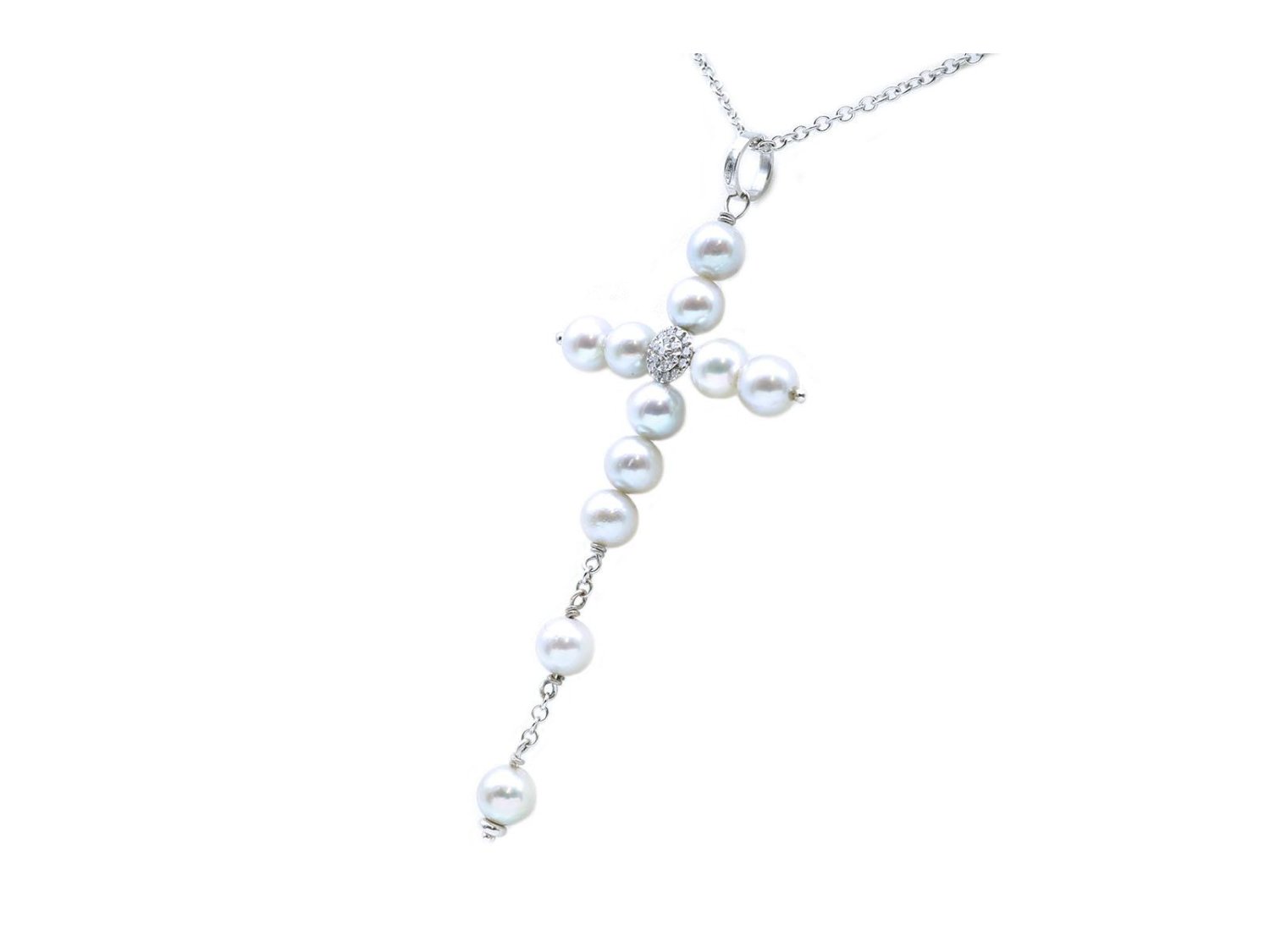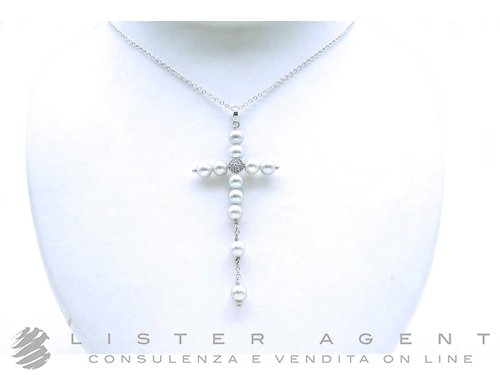 COLLANA Croce in oro bianco 18Kt con diamanti e perle mm 6.00. NUOVA!