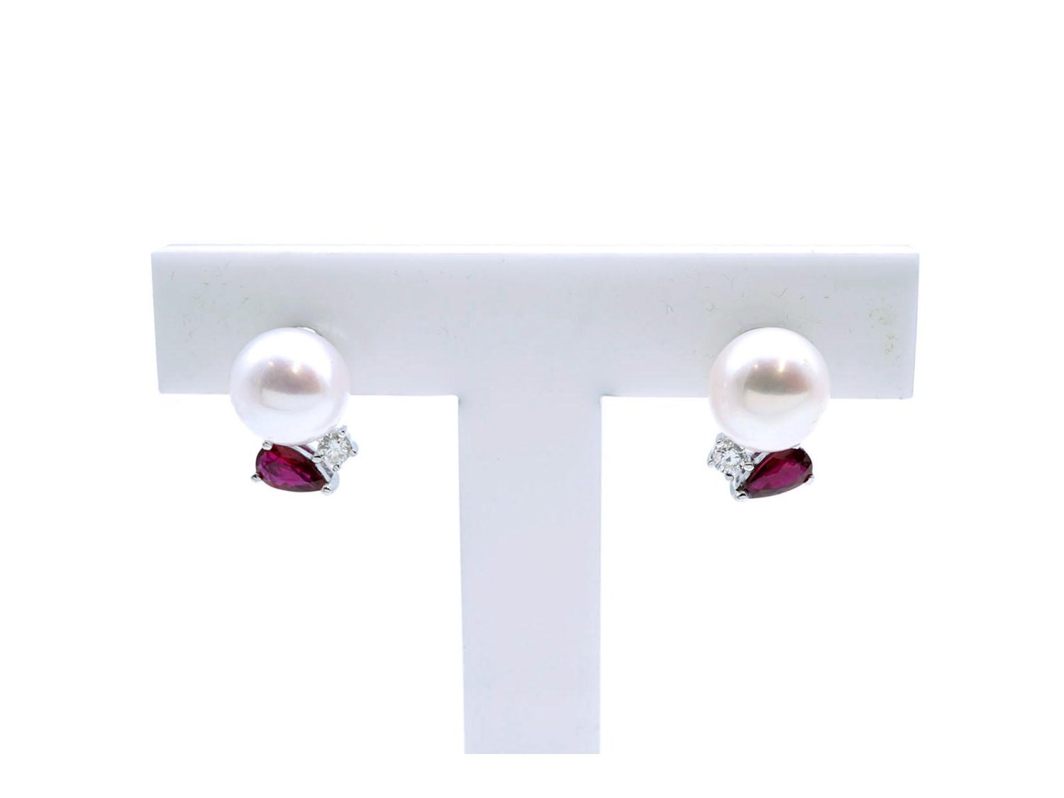 MIMI' orecchini Classic Akoya in oro bianco 18Kt con diamanti ct 0.10 G Vs, rubino ct 0.50 e perla Akoya mm 7.00-7.50 Ref. O25BCBKGRB. NUOVI!