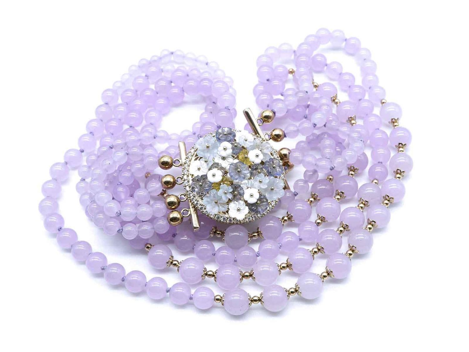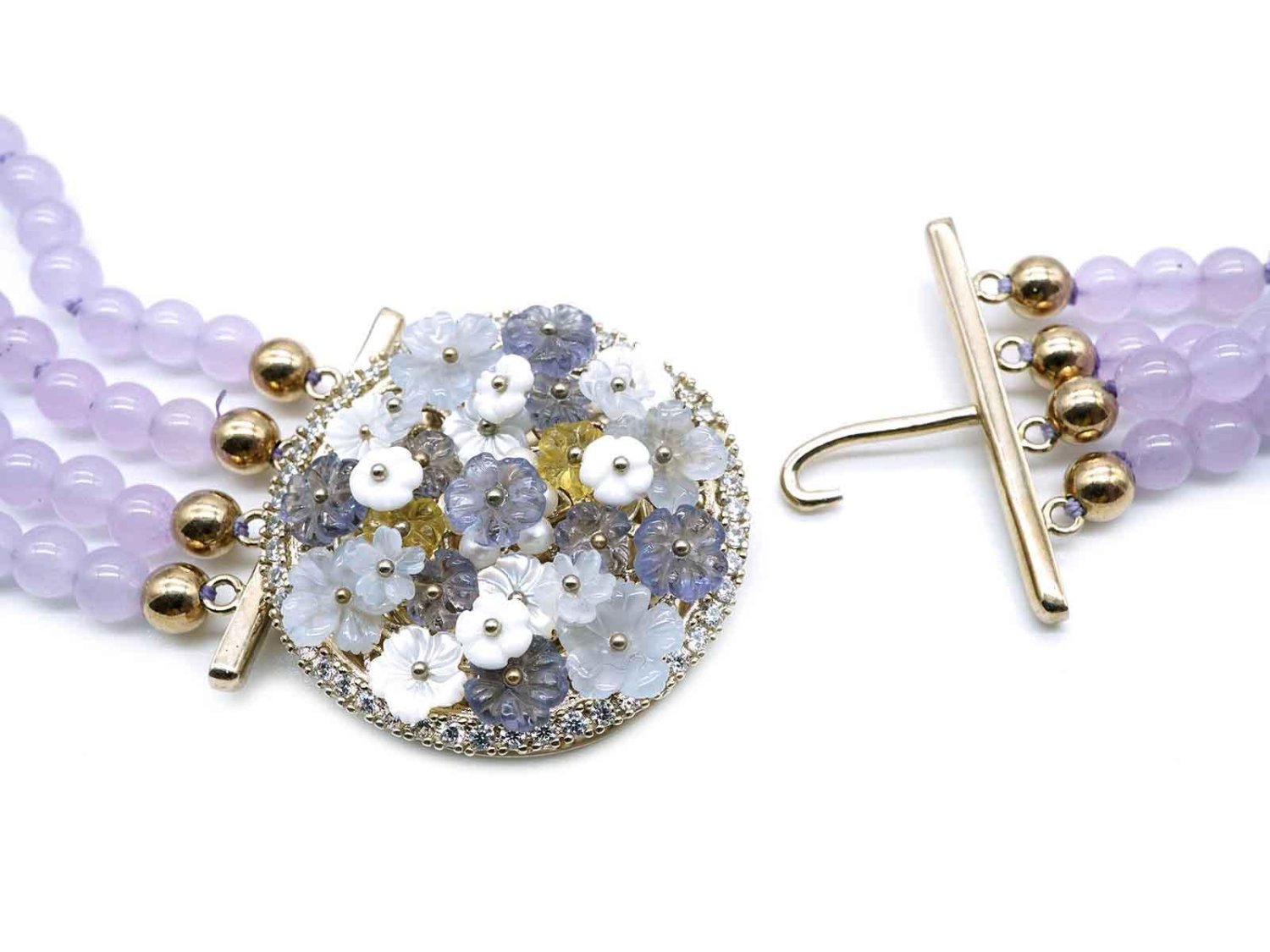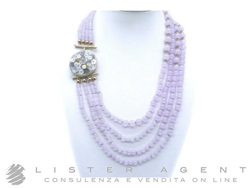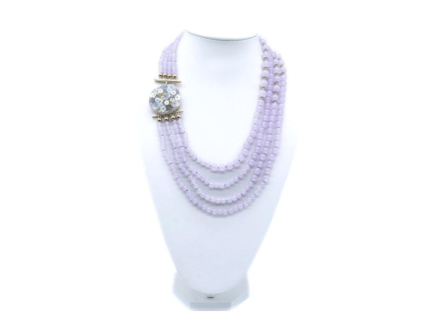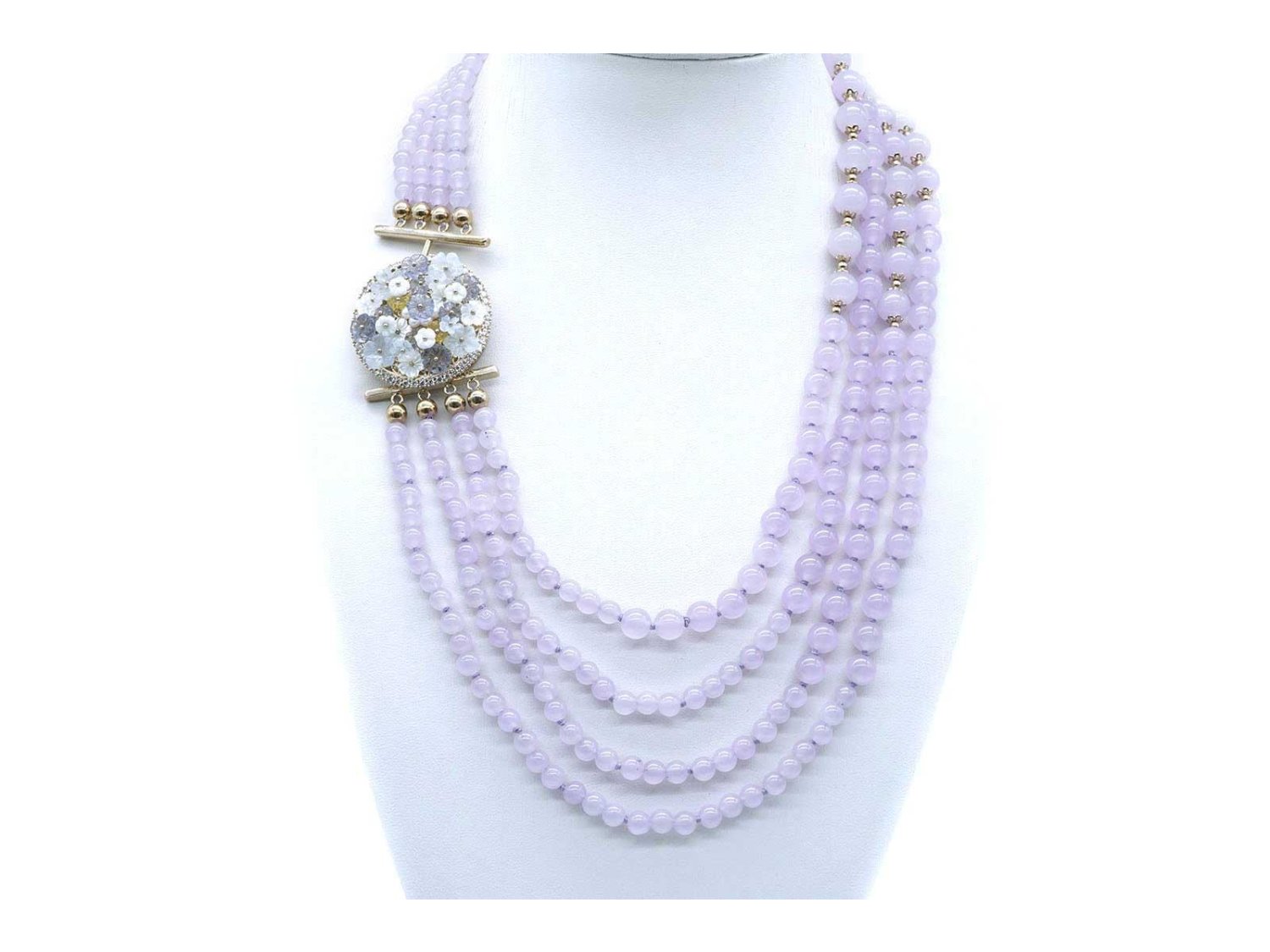 COLLANA in argento 925 placcato oro con giada naturale color lavanda e con ametista, quarzo, zirconi e madre perla. NUOVA!