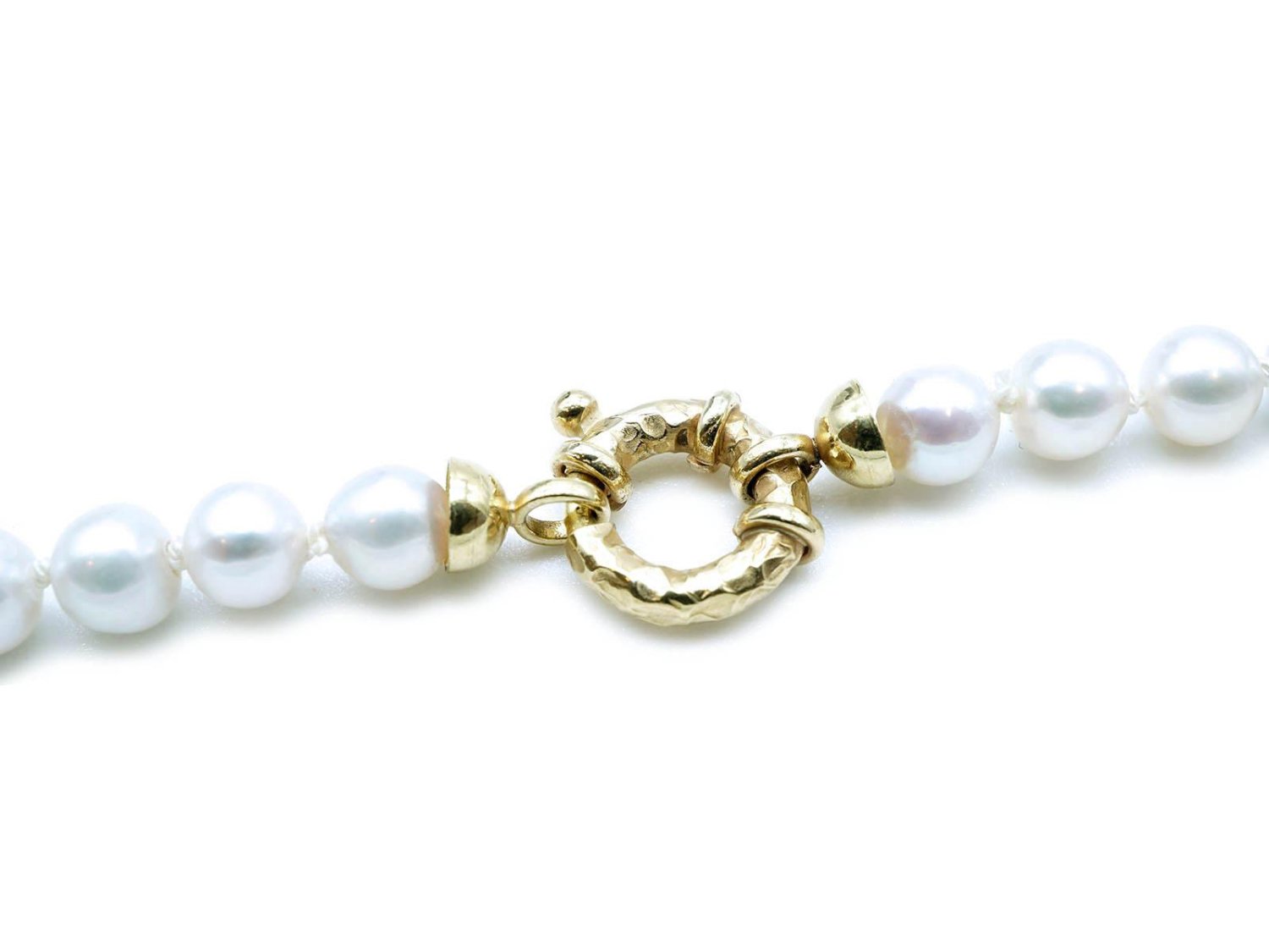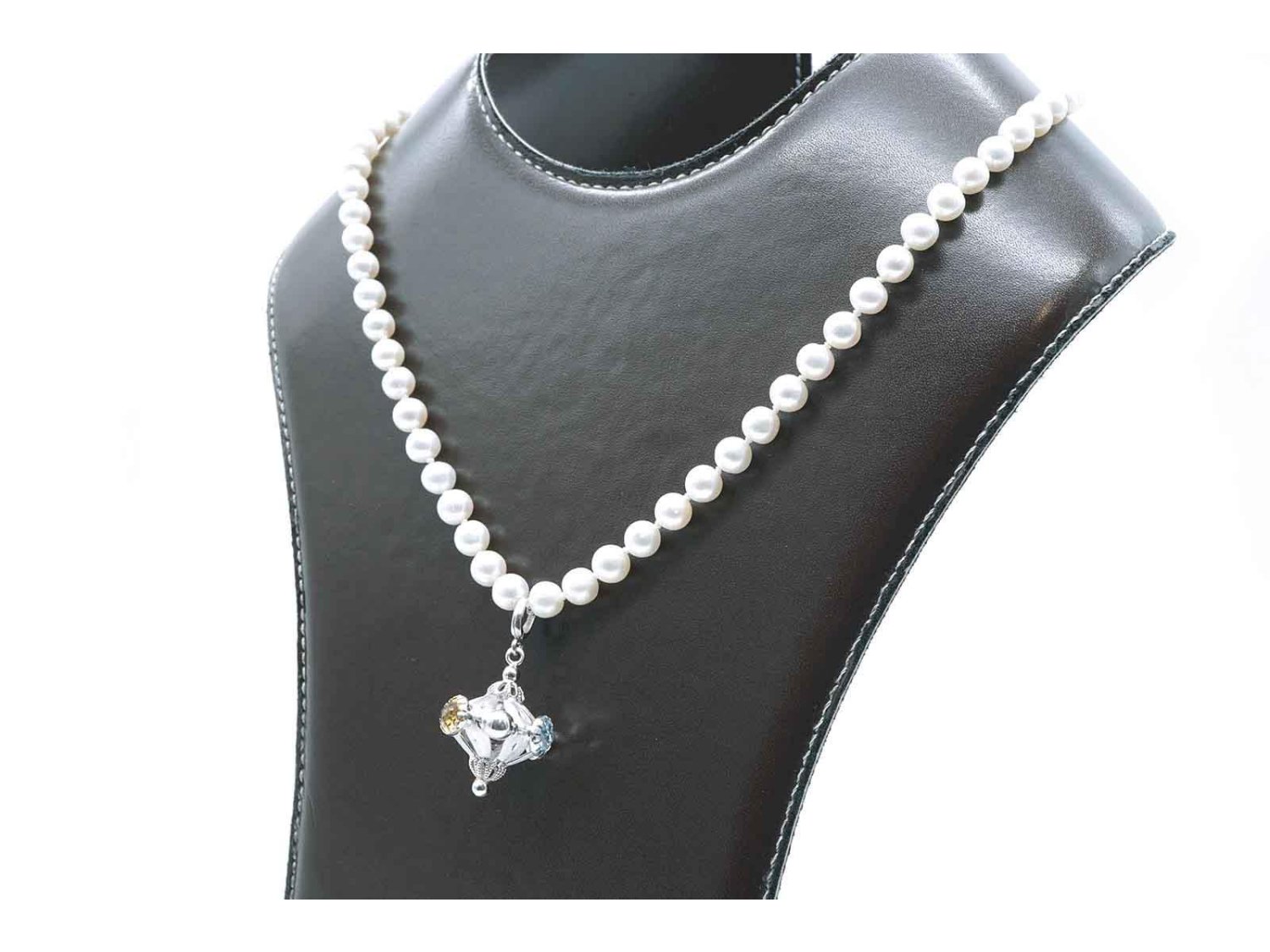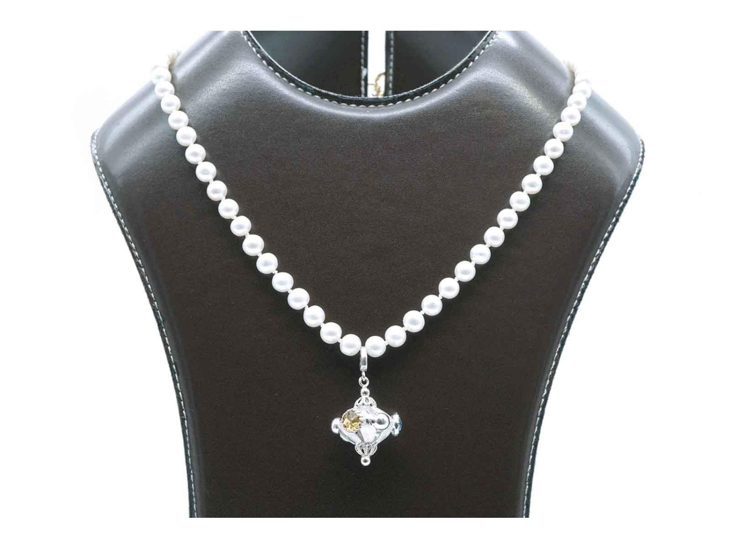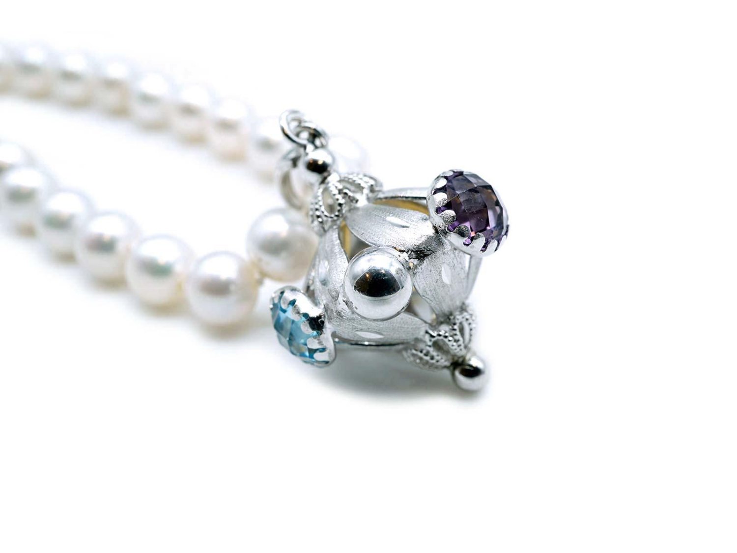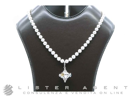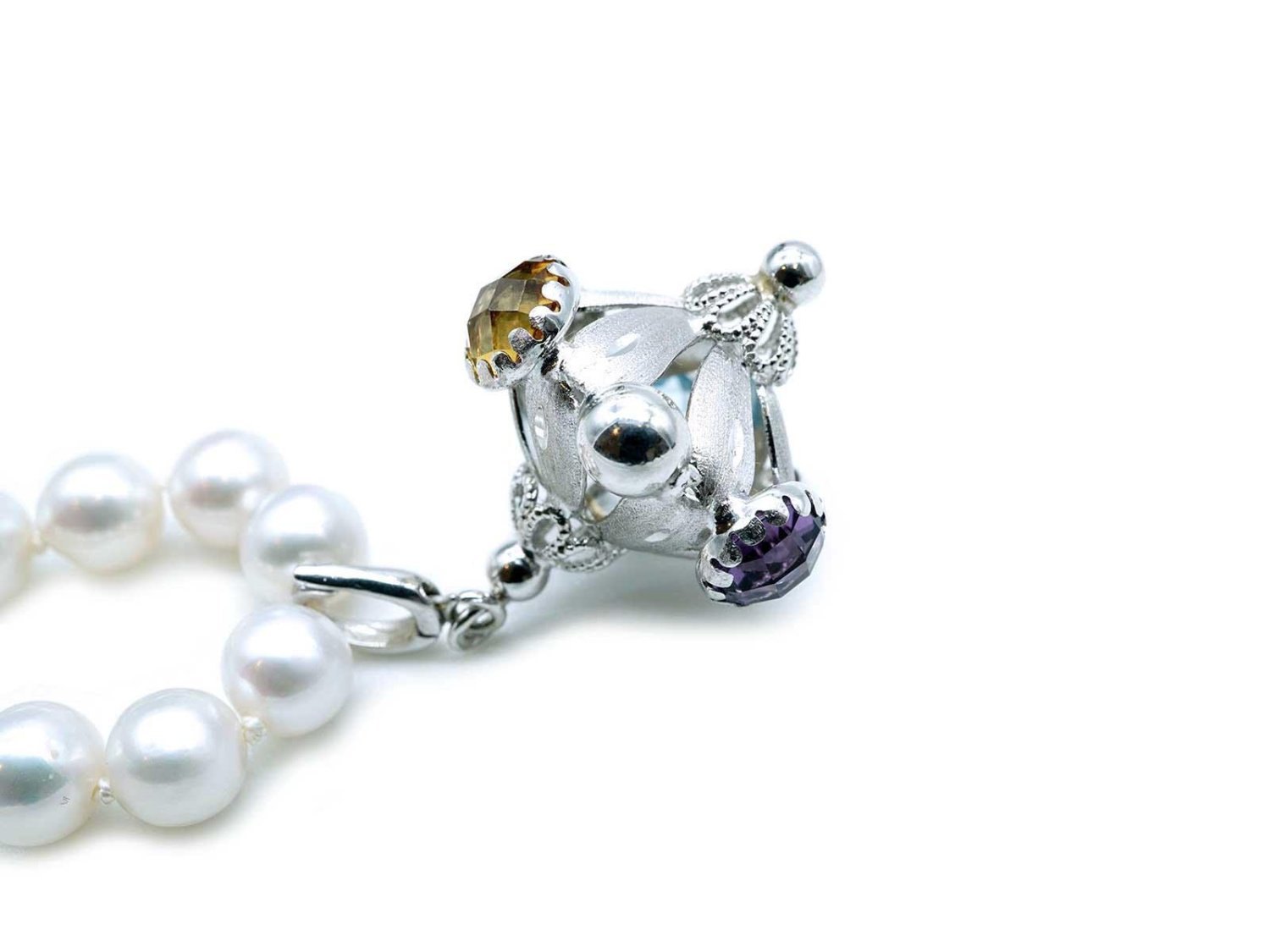 COLLANA perle bianche di acqua dolce con chiusura in oro giallo 18Kt e cindolo in oro bianco 18kt con ametista, topazio giallo e azzurro. NUOVA!