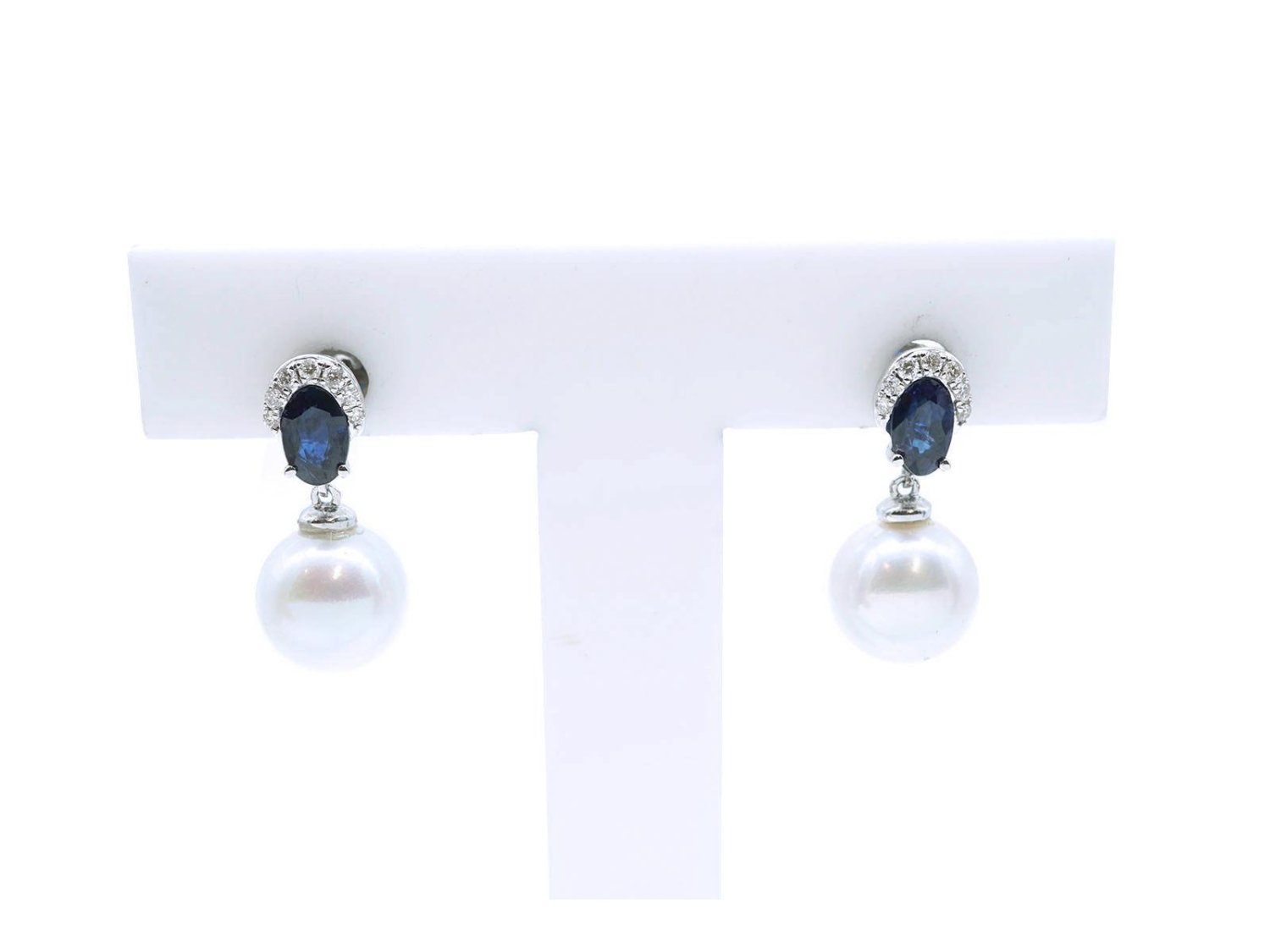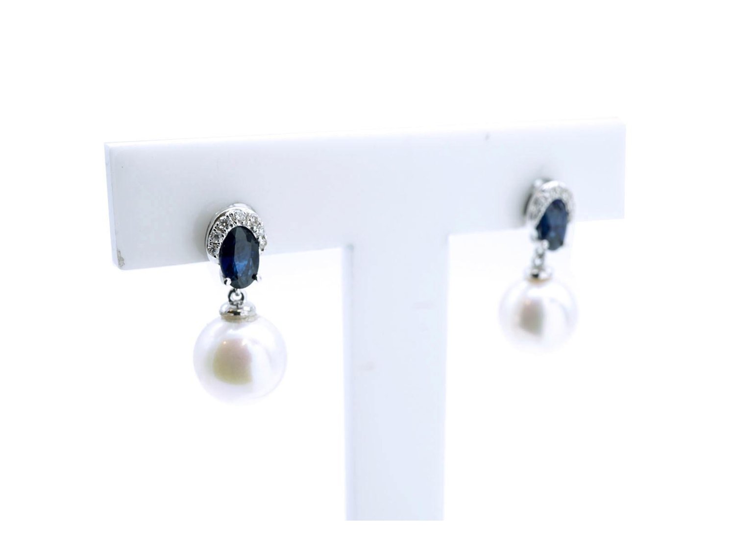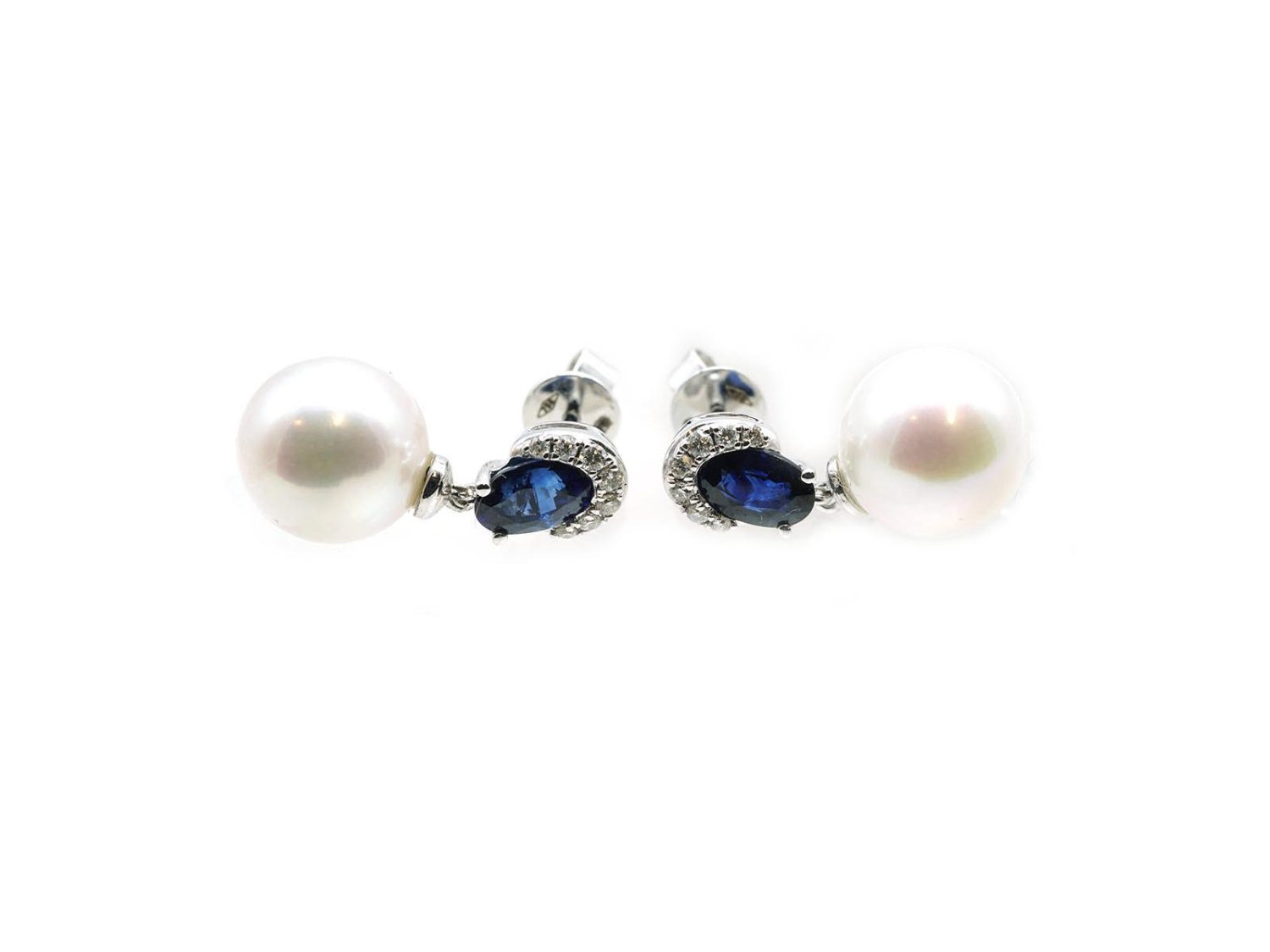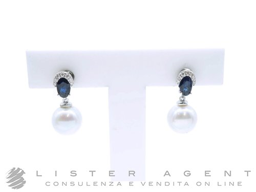 MIMI' orecchini Classic Akoya in oro bianco 18Kt con diamanti ct 0.07 G Vs, zaffiro blu ct 0.65 e perla Akoya mm 7.5-8.00 Ref. O25BCBKOZB. NUOVI!