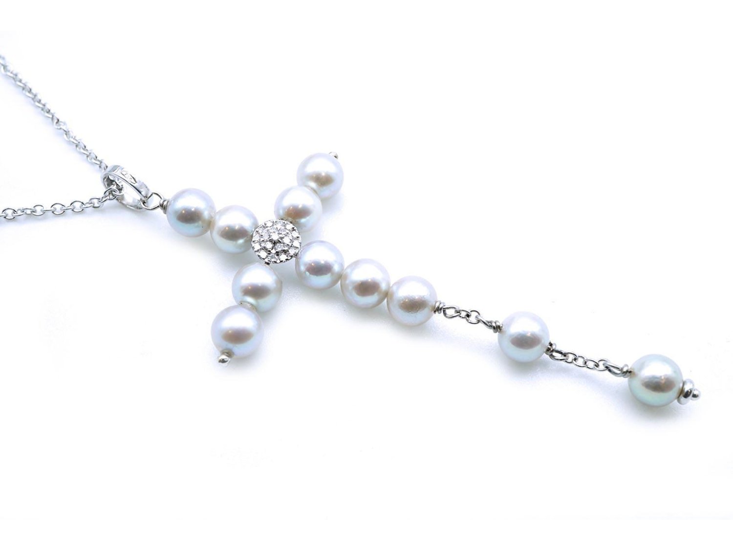 COLLANA Croce in oro bianco 18Kt con diamanti e perle mm 6.00. NUOVA!