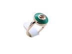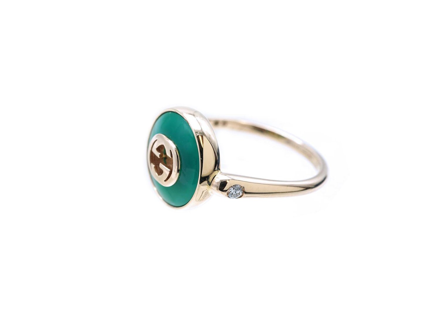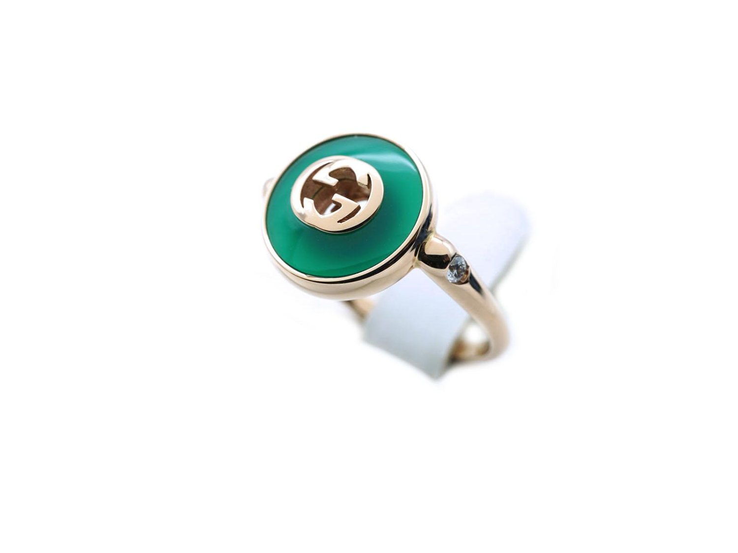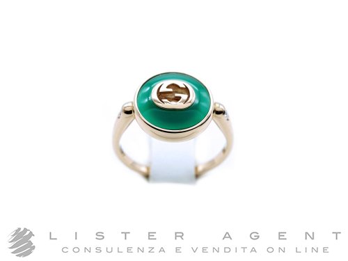 GUCCI anello Interlocking G 12MM in oro giallo 18Kt con diamanti ct 0,04 e agata verde Ref. YBC7865470020. NUOVO!