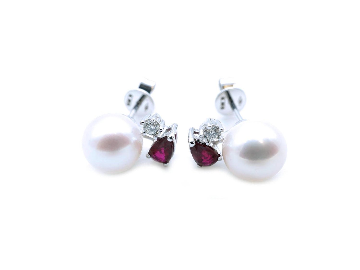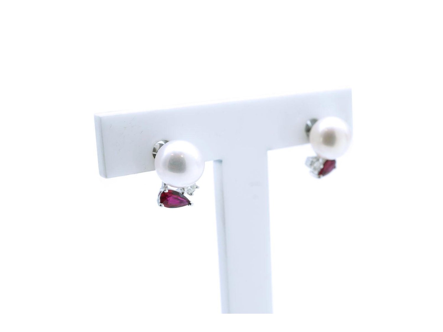 MIMI' orecchini Classic Akoya in oro bianco 18Kt con diamanti ct 0.10 G Vs, rubino ct 0.50 e perla Akoya mm 7.00-7.50 Ref. O25BCBKGRB. NUOVI!
